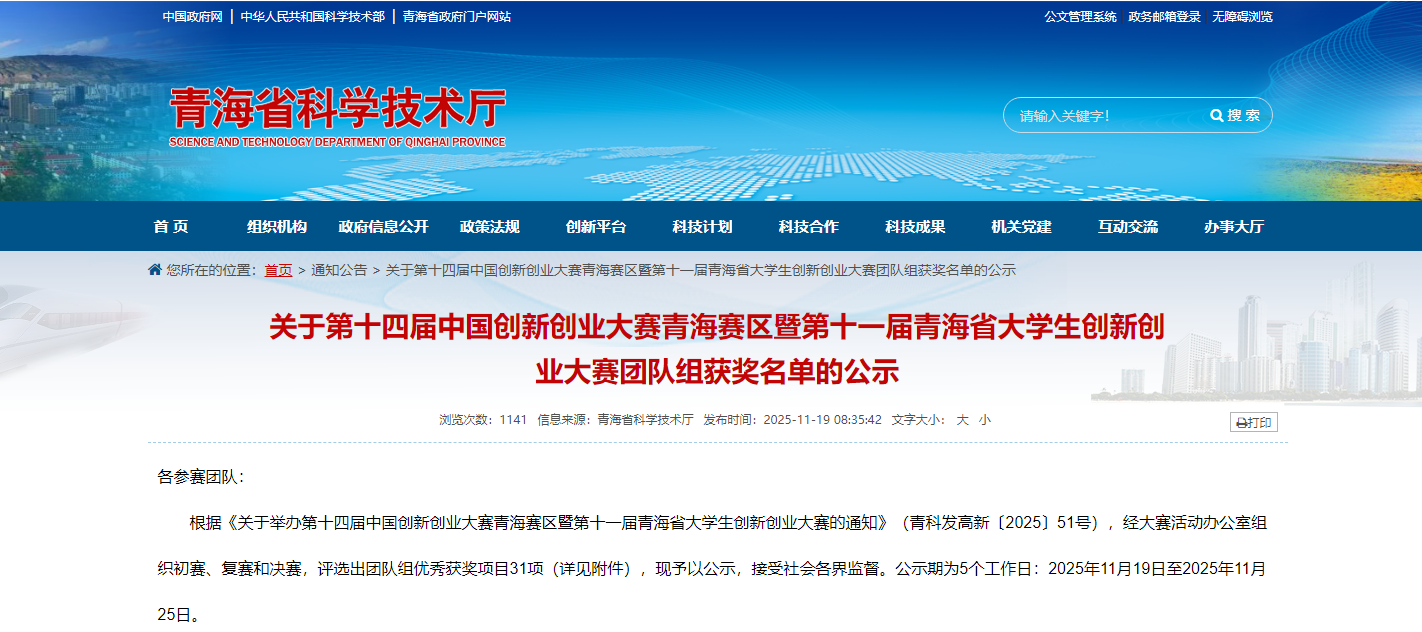 11月19日,青海省科学技术厅公示了第十四届中国创新创业大赛青海赛区暨第十一届青海省大学生创新创业大赛团队组获奖名单,其中,食品领域有8项项目获奖,公示期为5个工作日:2025年11月19日至2025年11月25日。