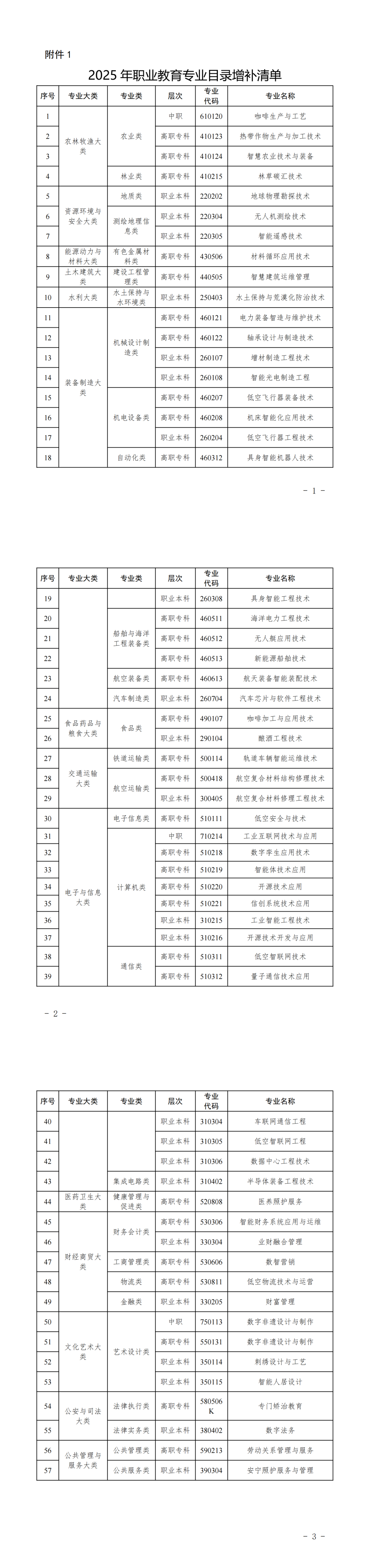 近日,教育部对2026年职业教育拟招生专业设置管理工作进行安排,并公布《2025年职业教育专业目录增补清单》,共包含57个职业教育专业。其中,中职专业3个、高职专科专业31个、职业本科专业23个。
