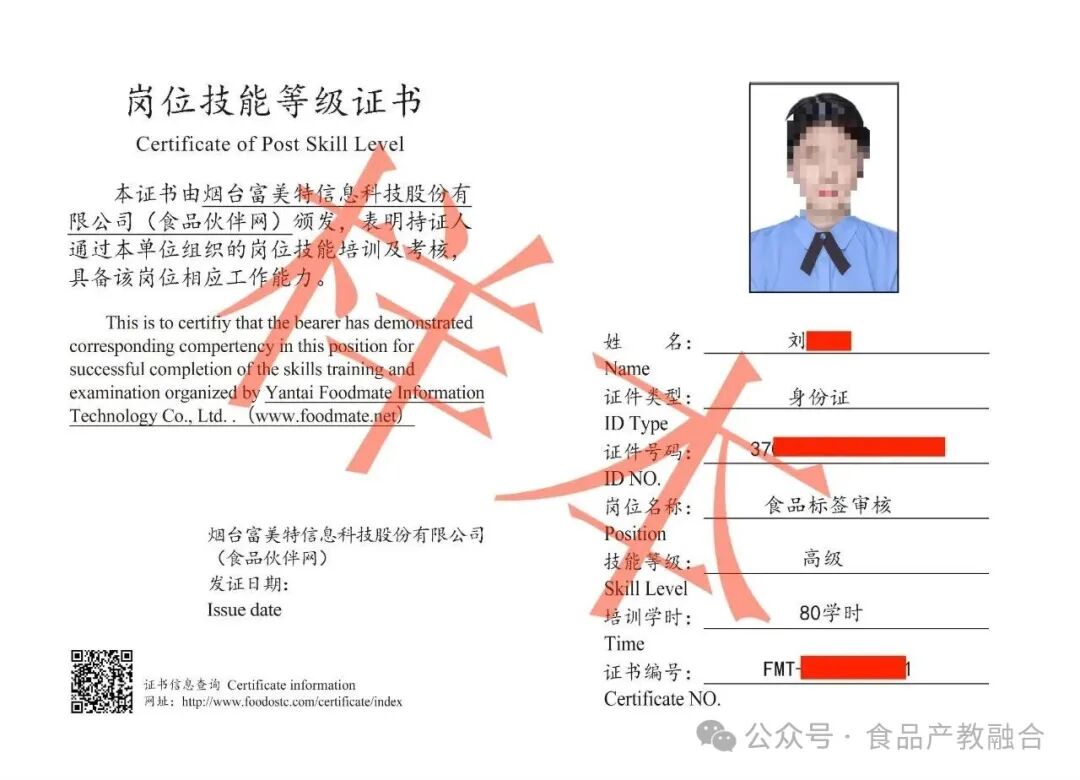 “食品标签审核岗位技能证书”是由烟台富美特信息科技股份有限公司(食品伙伴网)颁发,可在食品伙伴网证书查询中心https://www.foodmate.net/train/cert.php或食品行业职业技能培训中心网站//www.genuineautopart.com/可查,同时可作为培训学时证明。